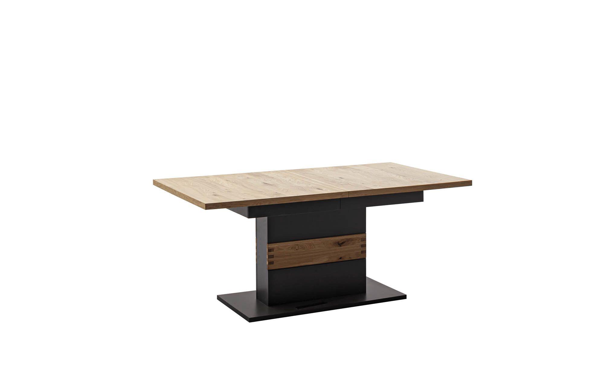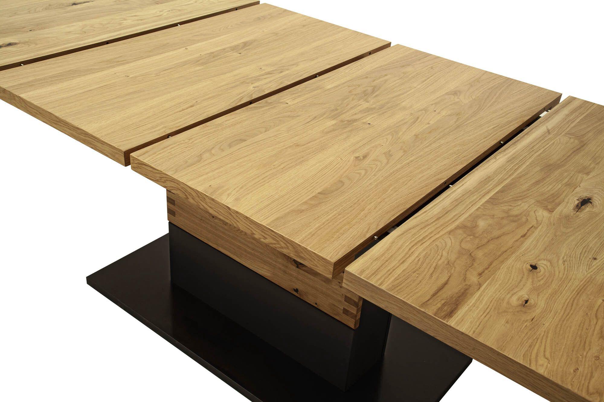Platte Wildeiche furniert, geölt, Säule schwarzgrau lackiert, Absetzung Wildeiche massiv geölt, Bodenplatte schwarzgrau lackiert, 2 innenliegende Einlegeböden à 50 cm, ausziehbar mit Synchronauszug, LBH ca. 180(280)/100/78 cm