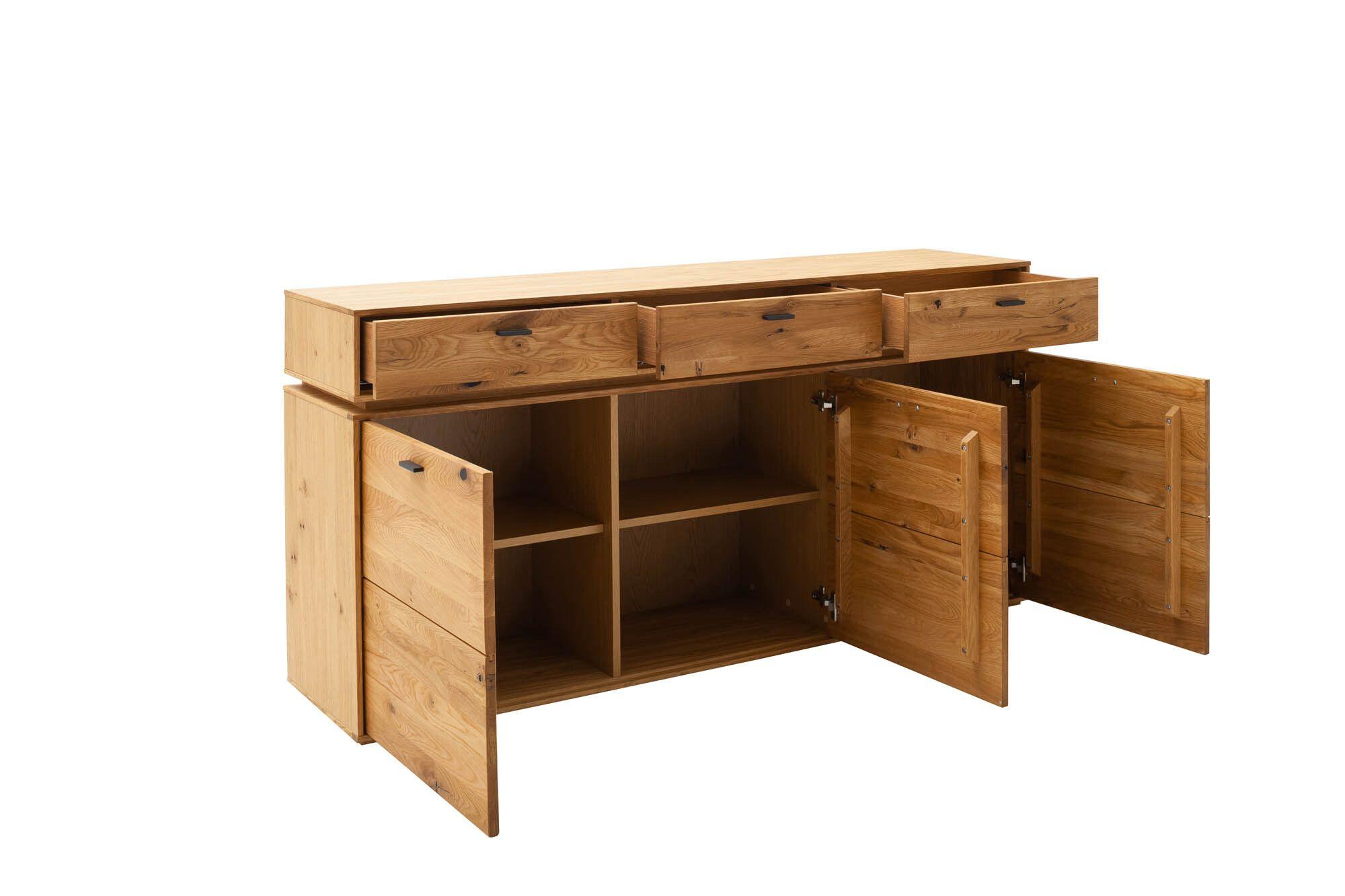 Front Wildeiche massiv durchgehende Lamelle, Oberfläche geölt, Korpus Wildeiche furniert, Oberfläche geölt, LED Beleuchtung mittig am Korpus inklusive, Griff Metall anthrazit, Türen und Schubkästen gedämpft, 3-türig, 3 Schubkästen, BHT ca. 183/90/44 cm