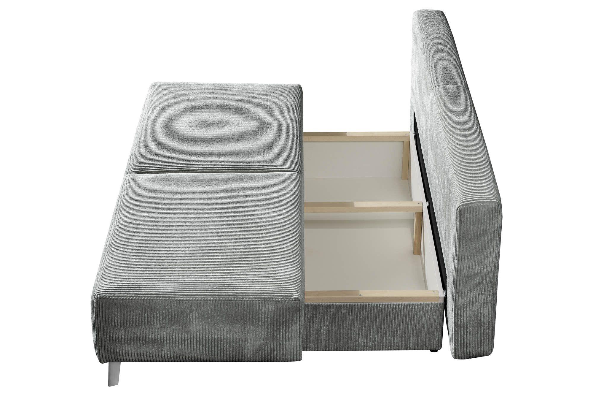 Stoff Cord, 100% Polyester, Farbe silber, Sitz Polyschaum auf Wellenfedern, geräumiger Bettkasten, Metallfüsse schwarz, Sitzhöhe ca. 43 cm, Liegehöhe 43 cm, Liegefläche 140 x 193 cm, BHT ca. 193/85/88 cm